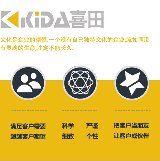 ?喜田(上海)貿易有限公司是專門負責為國內外自動化工業(yè)知名品牌在中國大陸及香港地區(qū)的推廣及代理.公司坐落于上海閘北高新技術園區(qū)內,位于公共設施,行政機關等比較集中,人群流動量較大的上海市中心.公司在閘北高新技術園區(qū)自購辦公樓二層,規(guī)模超過一千平方米.在職員工五十余人,平均文化水品本科以上,其中不乏自動化工業(yè)的專業(yè)性技術人才.是閘北高新技術的重點企業(yè).